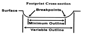 Remember the first contact area of your hand with the surface. If your hand went no deeper into that surface, your hand print would have only one size - the MINIMUM OUTLINE. If your hand sank deeper into the surface it would create a series of variable outlines as the mud flowed around the curved surface of your hand and fingers. All footprints have a minimum outline, but only prints that sink into a surface have variable outlines. Therefore, minimum outlines are the only constant and consistent size in tracking.To measure the minimum outline, study the bottom of a print to determine where the rounded pad turns upward (see Footprint Cross-section figure). The break point where the pad turns upward would be the minimum outline edge. Use this edge to measure tracks.
